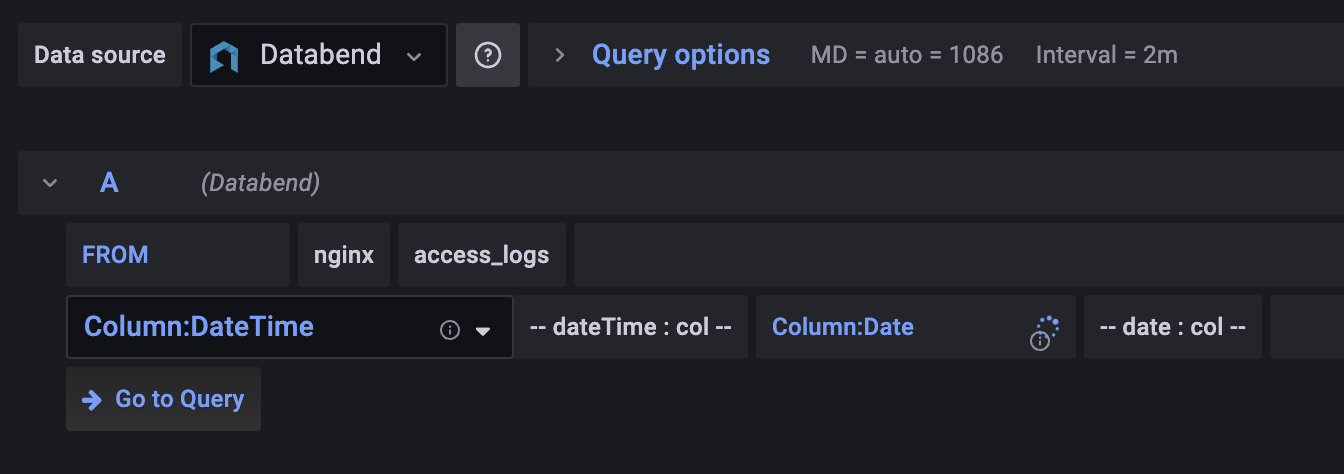 Create a new dashboard with a new panel, select the Datasource created in previous step.